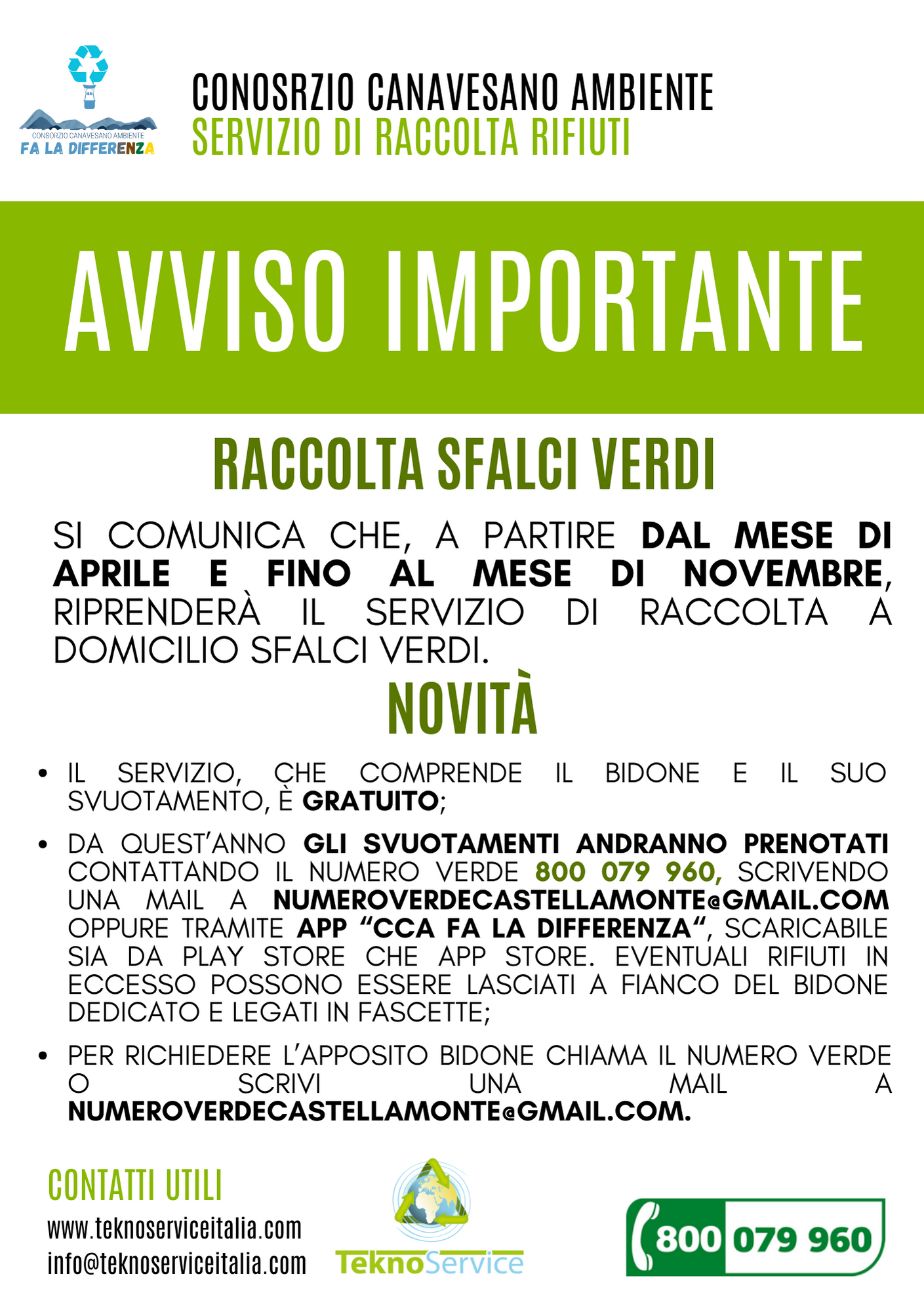 Calendario raccolta rifiuti 2024 ditta Teknoservice in vigore dal 01/04/2024.
