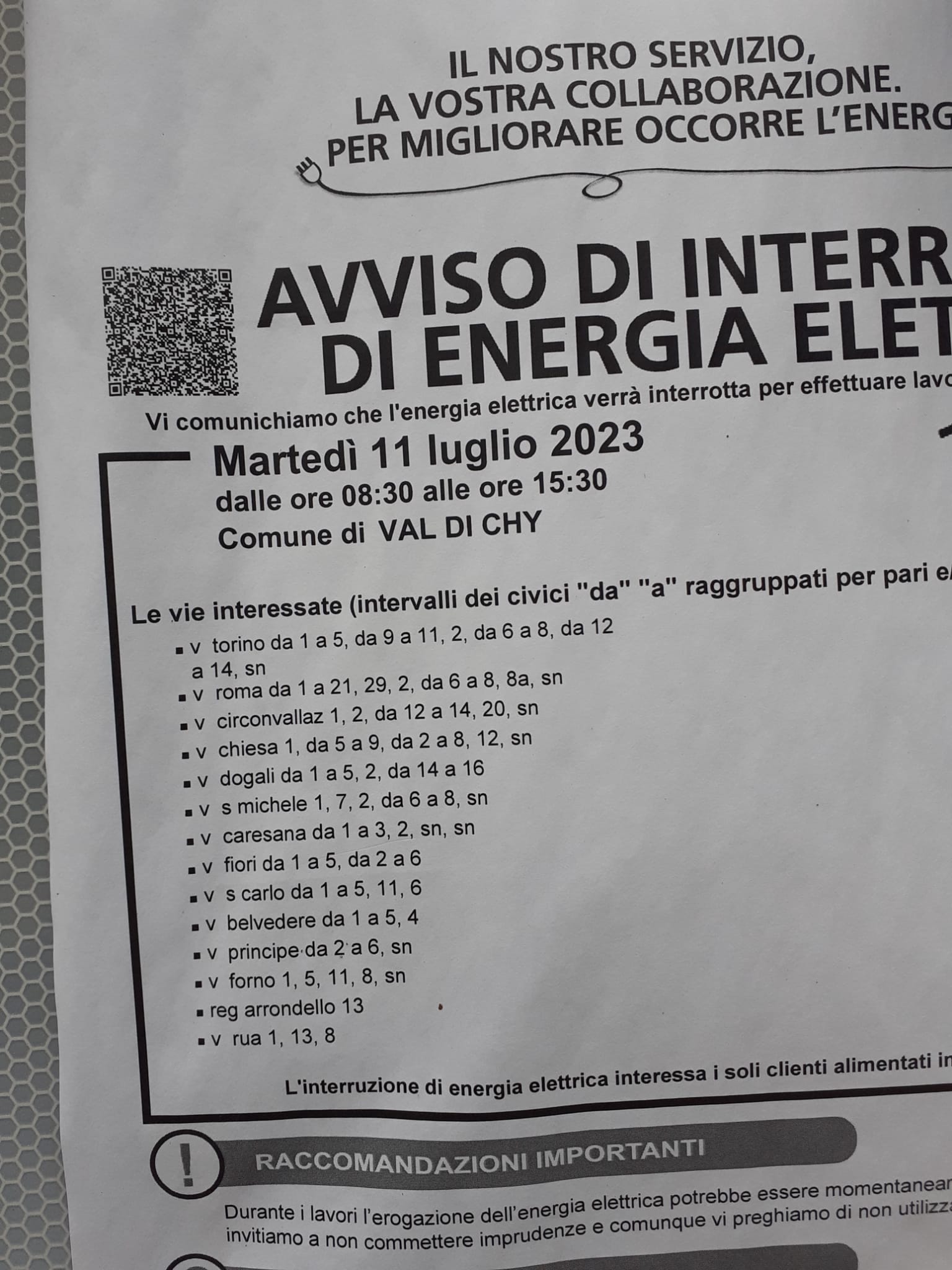 Enel - Avviso di Interruzione di Energia Elettrica - Zona Pecco - giorno 11.07.2023